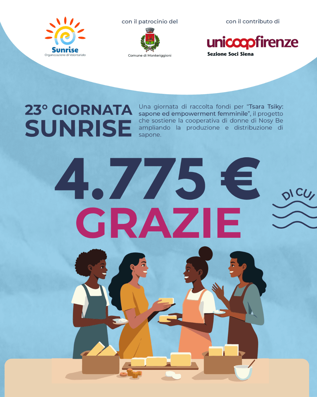 Vi aspettiamo il 5 ottobre per la 23° Giornata Sunrise, durante la quale raccoglieremo fondi per il progetto “Tsara Tsiky: sapone ed empowerment femminile“. Durante la giornata, che inizierà con la Messa e proseguirà con il pranzo a Badesse, presenteremo i progetti realizzati e quelli futuri.