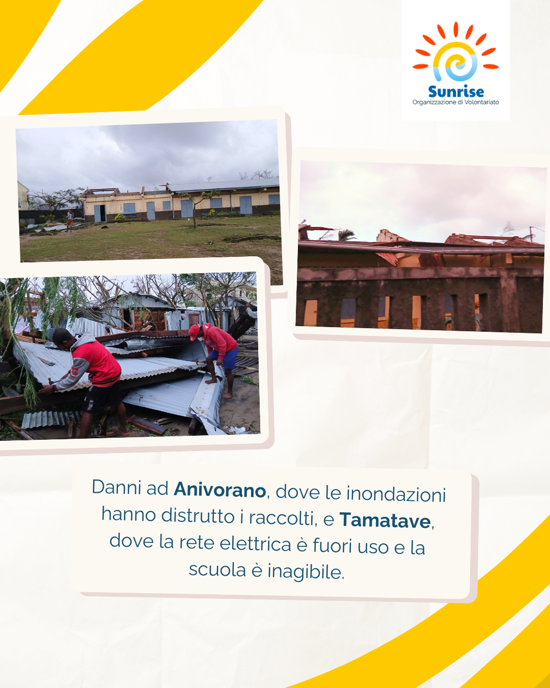 A Tamatave, la città portuale del paese, il 90% delle case ha perso il tetto e l’80% della rete elettrica è un ammasso di cavi tranciati. Verso l’entroterra, ad Anivorano, le inondazioni hanno distrutto i raccolti: mesi di fatica e l’unica fonte di sostentamento per intere famiglie sono svaniti.