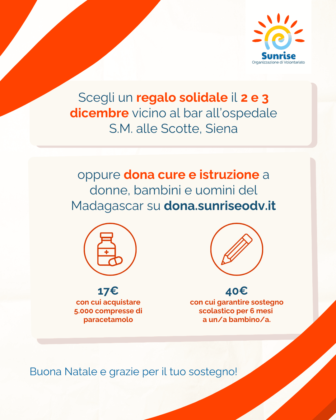 al mercatino di artigianato il 2 e 3 dicembre in ospedale, oppure sostieni i nostri progetti con una donazione su dona.sunriseodv.it 💛